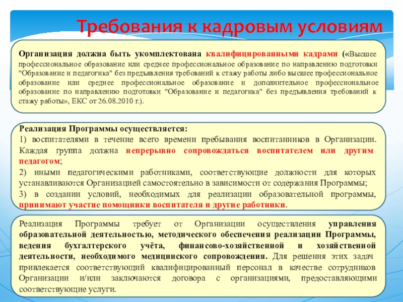 Реализация Программы требует от Организации осуществления управления образовательной деятельностью, методического обеспечения реализации Программы, ведения бухгалтерского учёта, финансово-хозяйственной и хозяйственной деятельности, необходимого медицинского сопровождения. Для решения этих задач привлекается соответствующий квалифицированный персонал в качестве сотрудников Организации и/или заключаются договора с организациями, предоставляющими соответствующие услуги.