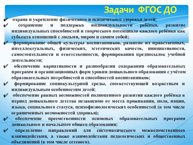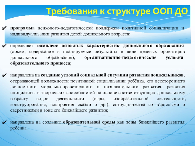 ФГОС ДО отражает согласованные социально-культурные, общественно-государственные ожидания относительно уровня ДО, которые являются ориентирами для учредителей дошкольных Организаций, специалистов системы образования, семей воспитанников и широкой общественности.
