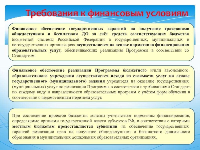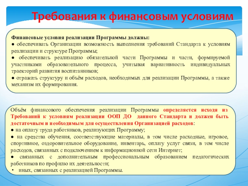 Объём финансового обеспечения реализации Программы определяется исходя из Требований к условиям реализации ООП ДО данного Стандарта и должен быть достаточным и необходимым для осуществления Организацией расходов: