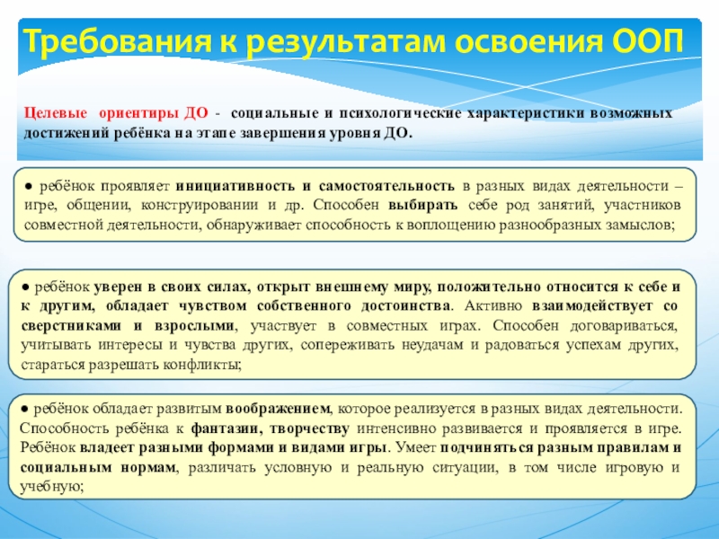 Целевые ориентиры ДО - социальные и психологические характеристики возможных достижений ребёнка на этапе завершения уровня ДО.