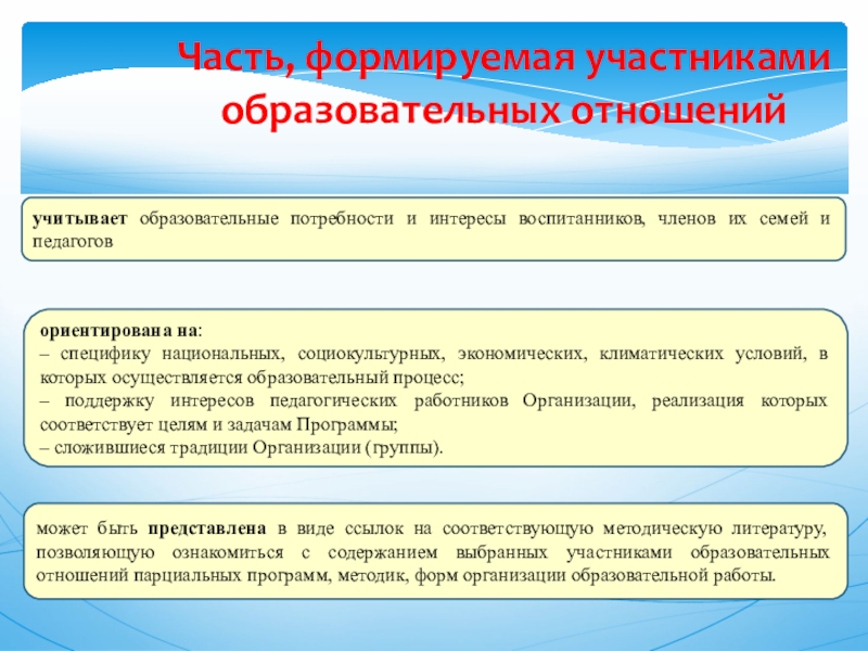 может быть представлена в виде ссылок на соответствующую методическую литературу, позволяющую ознакомиться с содержанием выбранных участниками образовательных отношений парциальных программ, методик, форм организации образовательной работы.