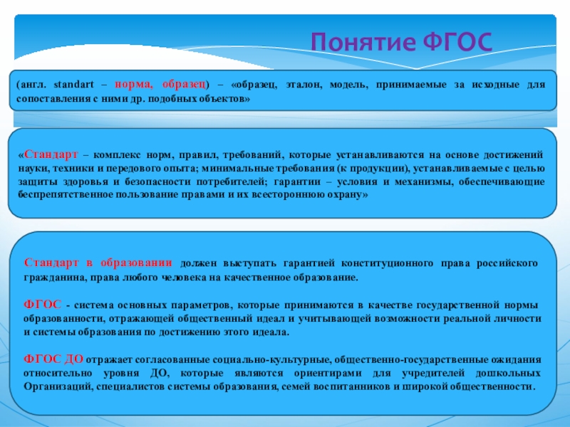 ФГОС - система основных параметров, которые принимаются в качестве государственной нормы образованности, отражающей общественный идеал и учитывающей возможности реальной личности и системы образования по достижению этого идеала.