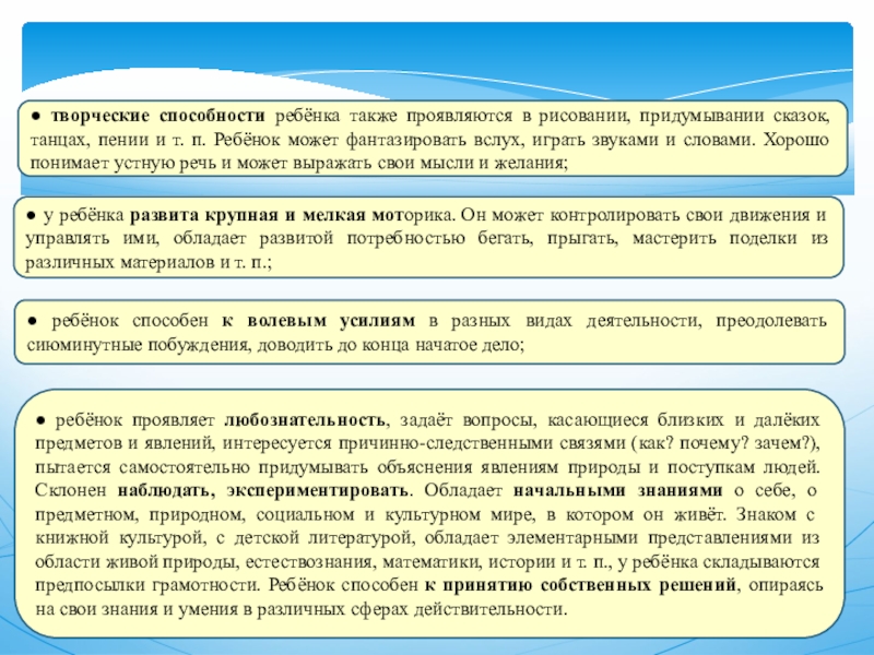 ● творческие способности ребёнка также проявляются в рисовании, придумывании сказок, танцах, пении и т. п. Ребёнок может фантазировать вслух, играть звуками и словами. Хорошо понимает устную речь и может выражать свои мысли и желания;