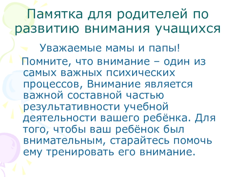 Слайд 19Памятка для родителей по развитию внимания учащихся