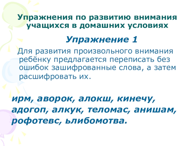 Слайд 8Упражнения по развитию внимания учащихся в домашних условиях