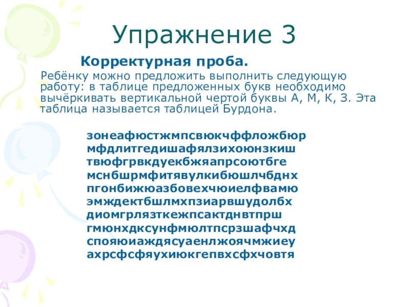 Ребёнку можно предложить выполнить следующую работу: в таблице предложенных букв необходимо вычёркивать вертикальной чертой буквы А, М, К, З. Эта таблица называется таблицей Бурдона.