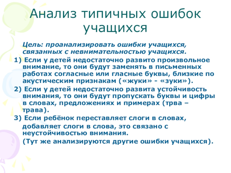 1) Если у детей недостаточно развито произвольное внимание, то они будут заменять в письменных работах согласные или гласные буквы, близкие по акустическим признакам («жуки» - «зуки»).