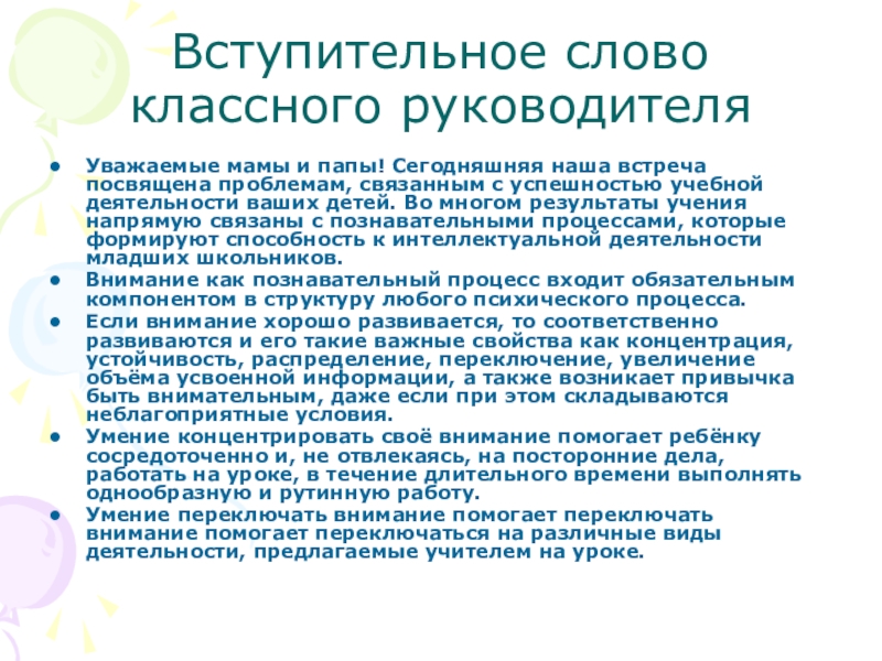 Умение переключать внимание помогает переключать внимание помогает переключаться на различные виды деятельности, предлагаемые учителем на уроке.