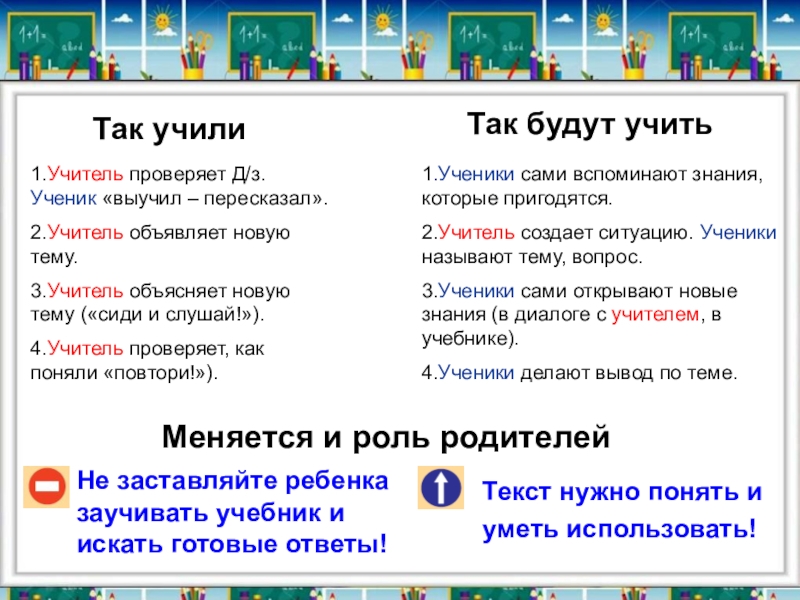 Так учили Так будут учитьНе заставляйте ребенка заучивать учебник и искать готовые ответы! Текст нужно понять и