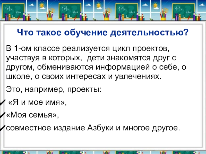 Что такое обучение деятельностью?В 1-ом классе реализуется цикл проектов, участвуя в которых, дети знакомятся друг с другом,