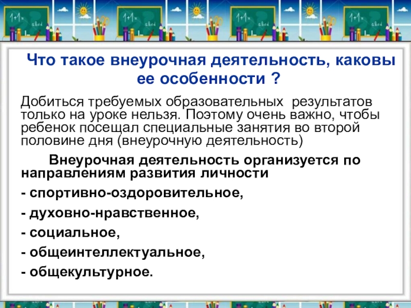 Что такое внеурочная деятельность, каковы ее особенности ?Добиться требуемых образовательных результатов только на уроке нельзя. Поэтому очень