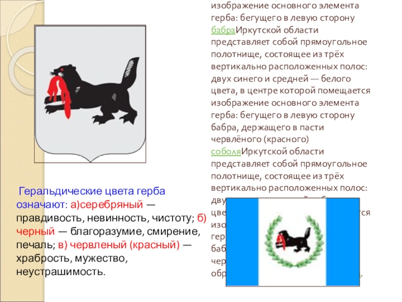 Геральдические цвета герба означают: а)серебряный — правдивость, невинность, чистоту; б) черный — благоразумие, смирение, печаль; в) червленый (красный) — храбрость, мужество, неустрашимость.