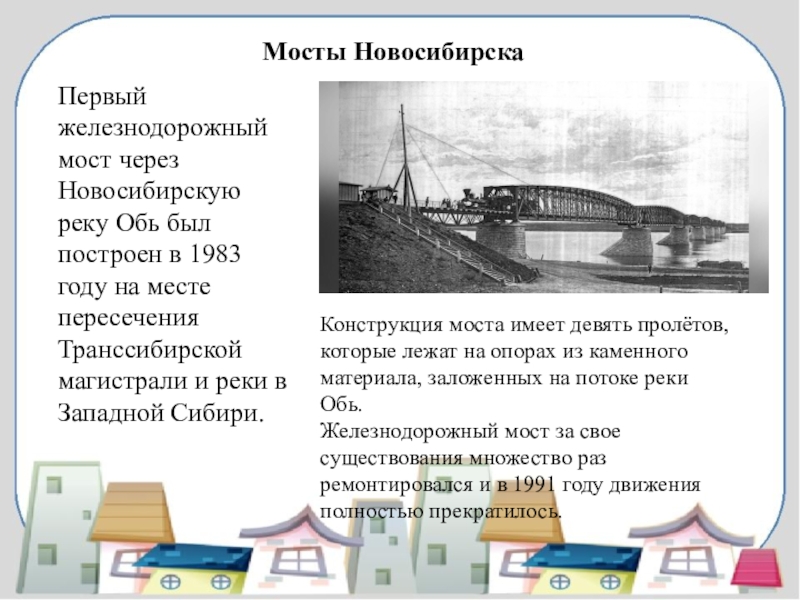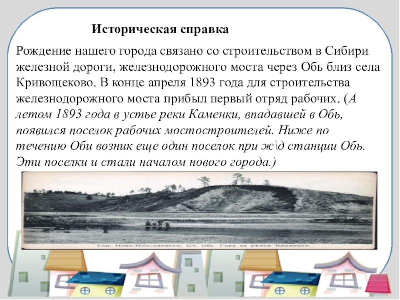 железнодорожного моста через Обь близ села Кривощеково. В конце апреля 1893 года для строительства железнодорожного моста прибыл первый отряд рабочих. (А летом 1893 года в устье реки Каменки, впадавшей в Обь, появился поселок рабочих мостостроителей. Ниже по течению Оби возник еще один поселок при ж\д станции Обь. Эти поселки и стали началом нового города.)