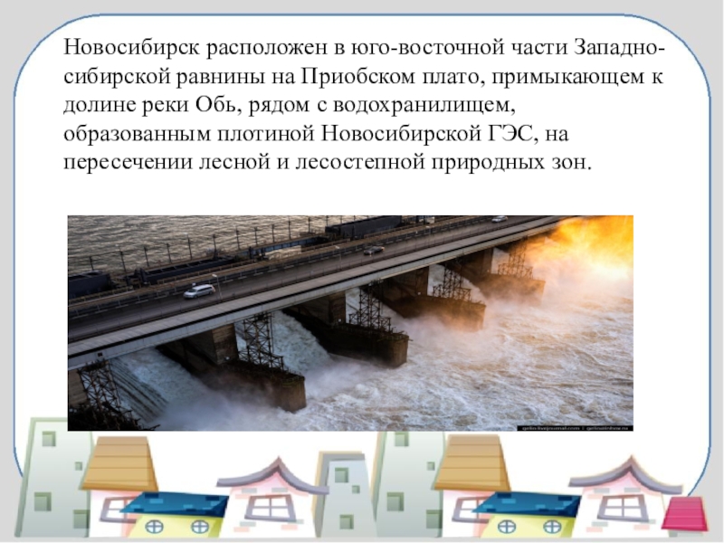 Слайд 20Новосибирск стоит на двух берегах, между которыми пролегает река Обь.