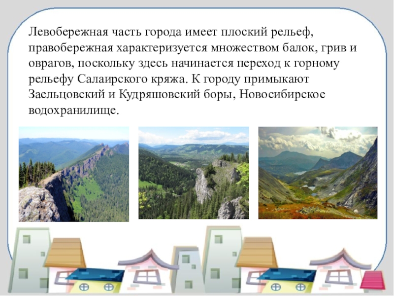 и оврагов, поскольку здесь начинается переход к горному рельефу Салаирского кряжа. К городу примыкают Заельцовский и Кудряшовский боры, Новосибирское водохранилище.