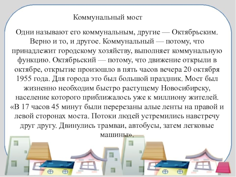 и другое. Коммунальный — потому, что принадлежит городскому хозяйству, выполняет коммунальную функцию. Октябрьский — потому, что движение открыли в октябре, открытие произошло в пять часов вечера 20 октября 1955 года. Для города это был большой праздник. Мост был жизненно необходим быстро растущему Новосибирску, население которого приближалось уже к миллиону жителей.