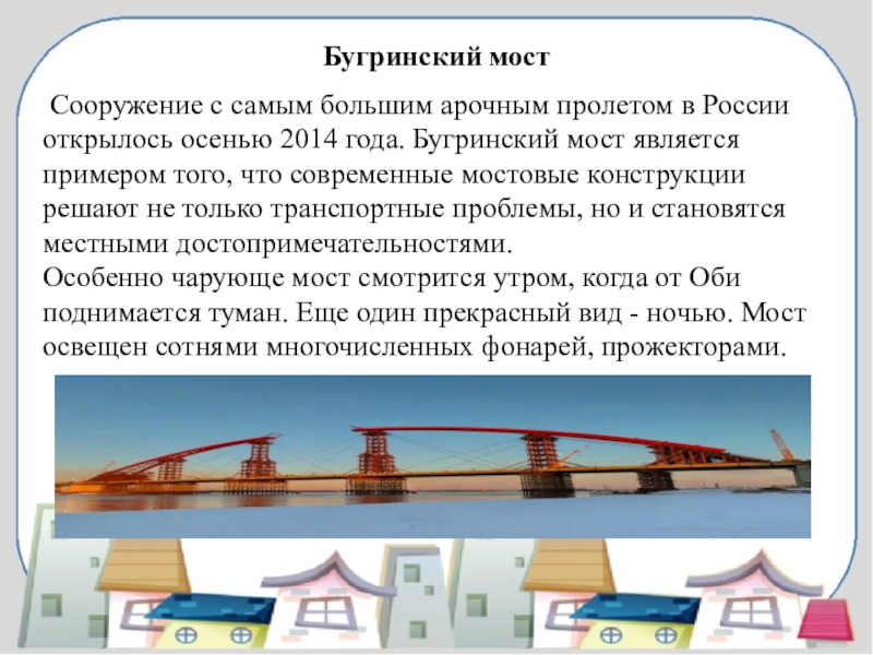 2014 года. Бугринский мост является примером того, что современные мостовые конструкции решают не только транспортные проблемы, но и становятся местными достопримечательностями.
