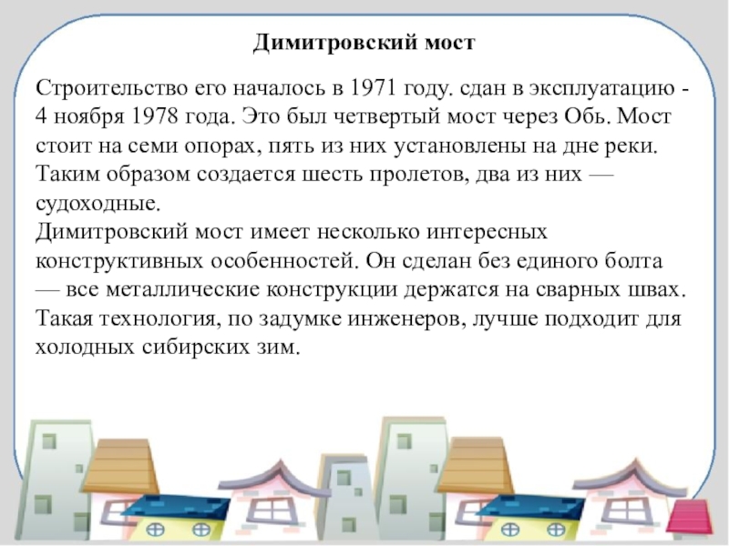 Димитровский мост имеет несколько интересных конструктивных особенностей. Он сделан без единого болта — все металлические конструкции держатся на сварных швах. Такая технология, по задумке инженеров, лучше подходит для холодных сибирских зим.