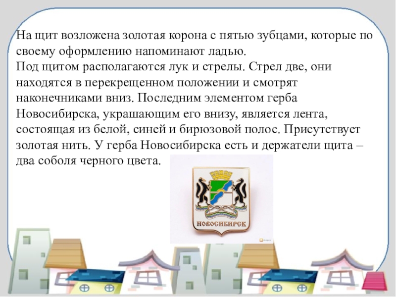 Под щитом располагаются лук и стрелы. Стрел две, они находятся в перекрещенном положении и смотрят наконечниками вниз. Последним элементом герба Новосибирска, украшающим его внизу, является лента, состоящая из белой, синей и бирюзовой полос. Присутствует золотая нить. У герба Новосибирска есть и держатели щита – два соболя черного цвета.