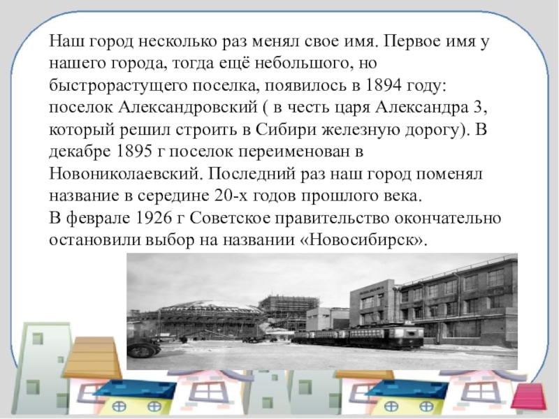 города, тогда ещё небольшого, но быстрорастущего поселка, появилось в 1894 году: поселок Александровский ( в честь царя Александра 3, который решил строить в Сибири железную дорогу). В декабре 1895 г поселок переименован в Новониколаевский. Последний раз наш город поменял название в середине 20-х годов прошлого века.