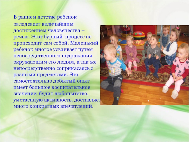 Слайд 2 В раннем детстве ребенок овладевает величайшим достижением человечества –