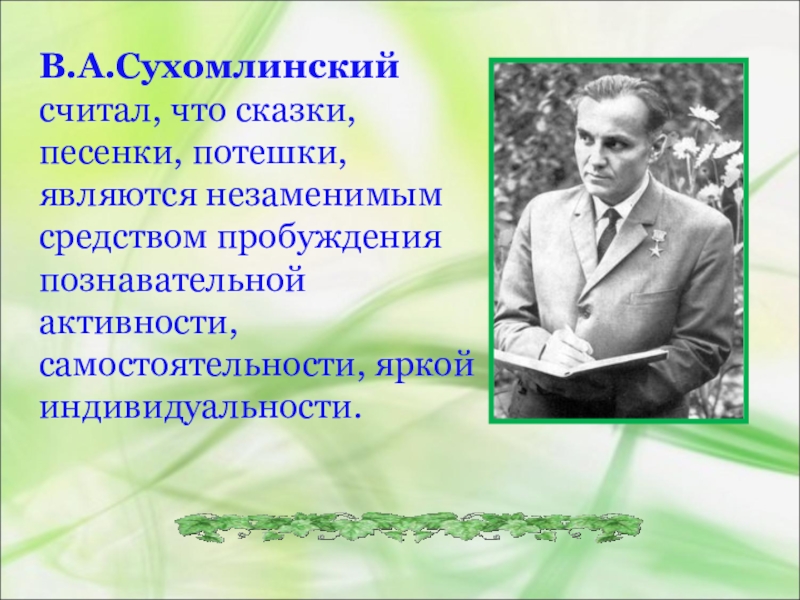 Слайд 9В.А.Сухомлинский считал, что сказки, песенки, потешки, являются незаменимым средством пробуждения познавательной