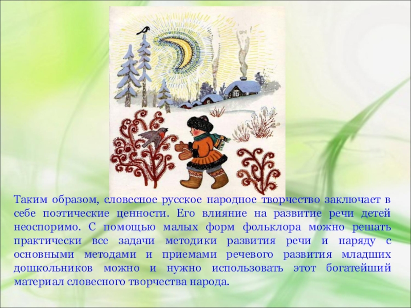 Слайд 17Таким образом, словесное русское народное творчество заключает в себе поэтические ценности.