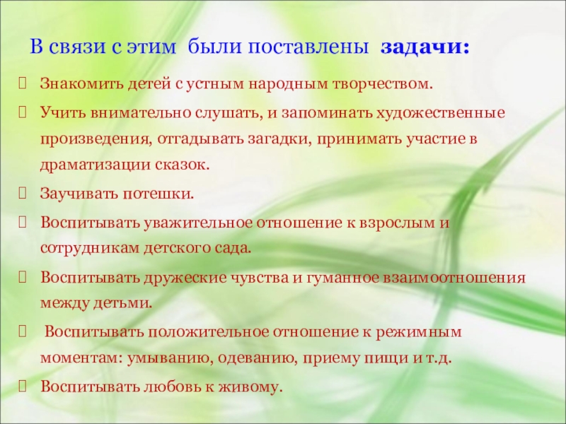 Его влияние на развитие речи детей неоспоримо. С помощью малых форм фольклора можно решать практически все задачи методики развития речи и наряду с основными методами и приемами речевого развития младших дошкольников можно и нужно использовать этот богатейший материал словесного творчества народа.