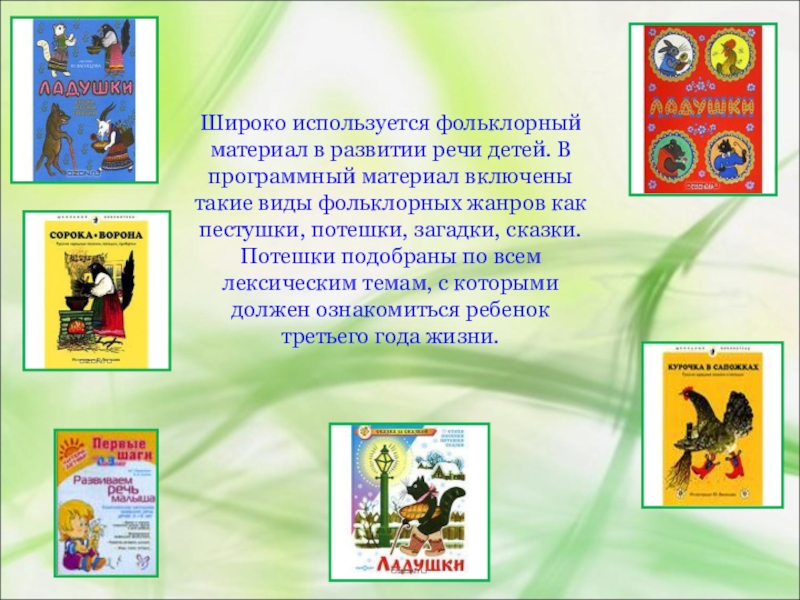 Слайд 24Широко используется фольклорный материал в развитии речи детей. В программный материал