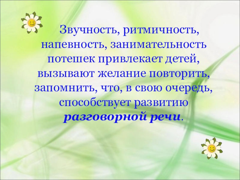 Слайд 11 Звучность, ритмичность, напевность, занимательность потешек привлекает детей, вызывают желание повторить, запомнить,