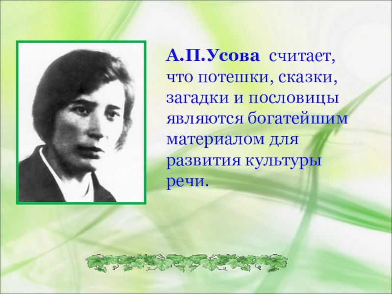 Слайд 8А.П.Усова считает, что потешки, сказки, загадки и пословицы являются богатейшим материалом