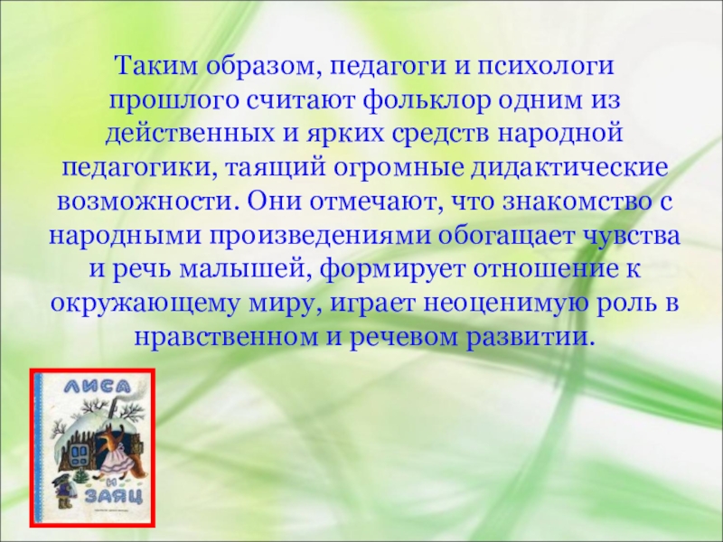 Слайд 10Таким образом, педагоги и психологи прошлого считают фольклор одним из действенных