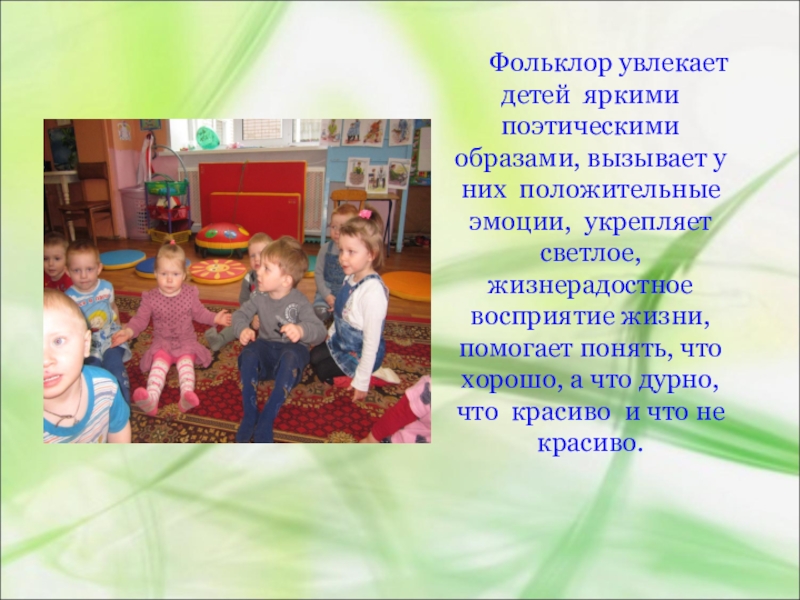 Слайд 4 Фольклор увлекает детей яркими поэтическими образами, вызывает у