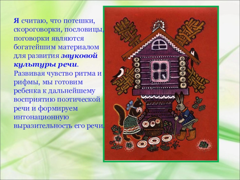 Слайд 16Я считаю, что потешки, скороговорки, пословицы, поговорки являются богатейшим материалом для