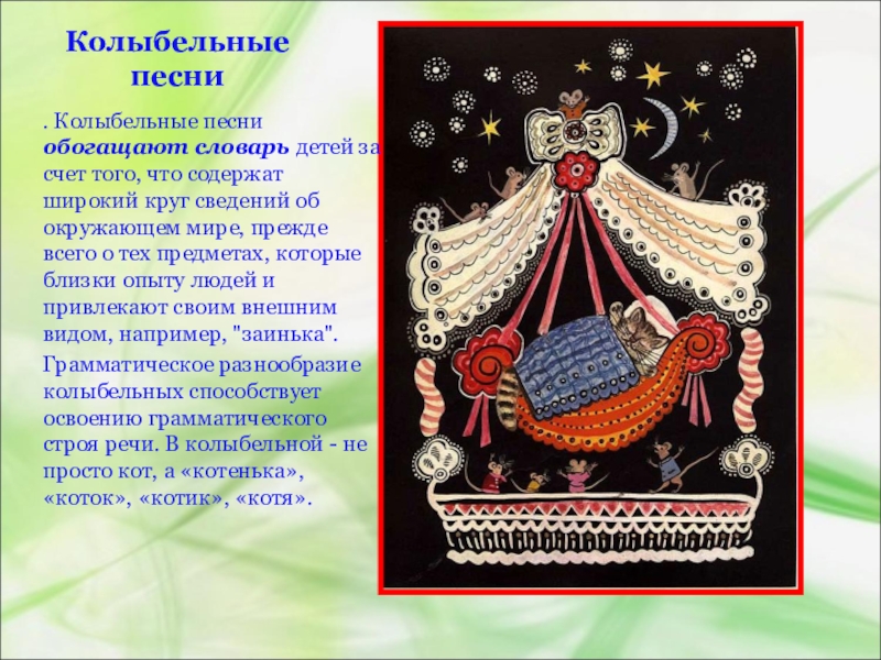 Грамматическое разнообразие колыбельных способствует освоению грамматического строя речи. В колыбельной - не просто кот, а «котенька», «коток», «котик», «котя».