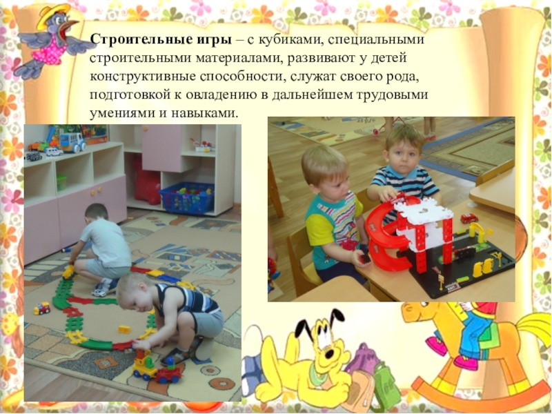 Слайд 9Строительные игры – с кубиками, специальными строительными материалами, развивают у детей конструктивные