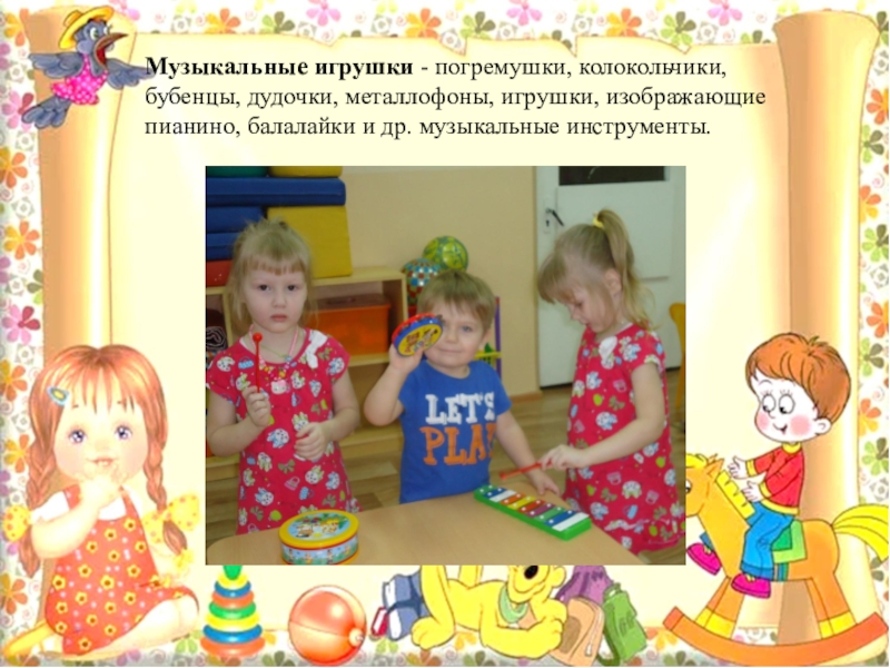 Слайд 10Музыкальные игрушки - погремушки, колокольчики, бубенцы, дудочки, металлофоны, игрушки, изображающие пианино, балалайки
