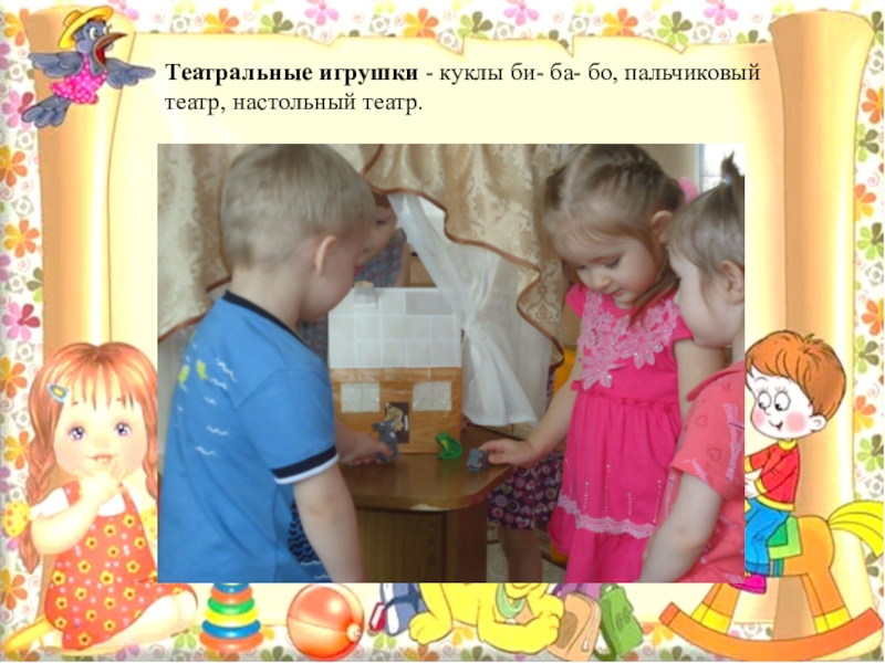 Слайд 11Театральные игрушки - куклы би- ба- бо, пальчиковый театр, настольный театр.