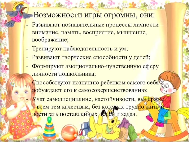 Именно игровой деятельности принадлежит особо значимая роль в развитии личности ребенка, в формировании важнейших черт характера, обогащении внутреннего мира.