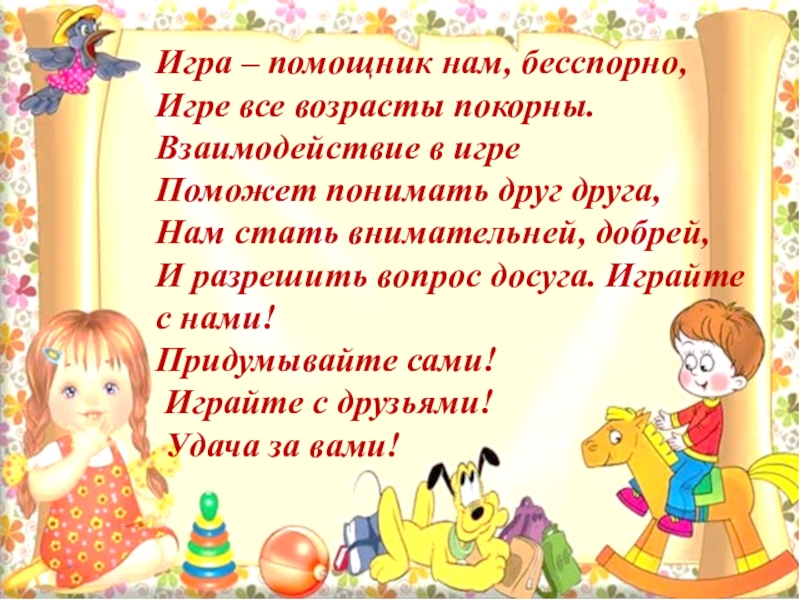 Нам стать внимательней, добрей, И разрешить вопрос досуга. Играйте с нами!