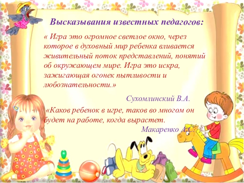 духовный мир ребенка вливается живительный поток представлений, понятий об окружающем мире. Игра это искра, зажигающая огонек пытливости и любознательности.»