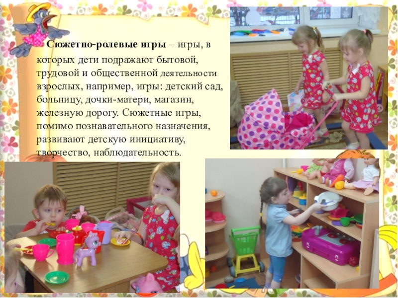 Слайд 6 Сюжетно-ролевые игры – игры, в которых дети подражают бытовой, трудовой и общественной