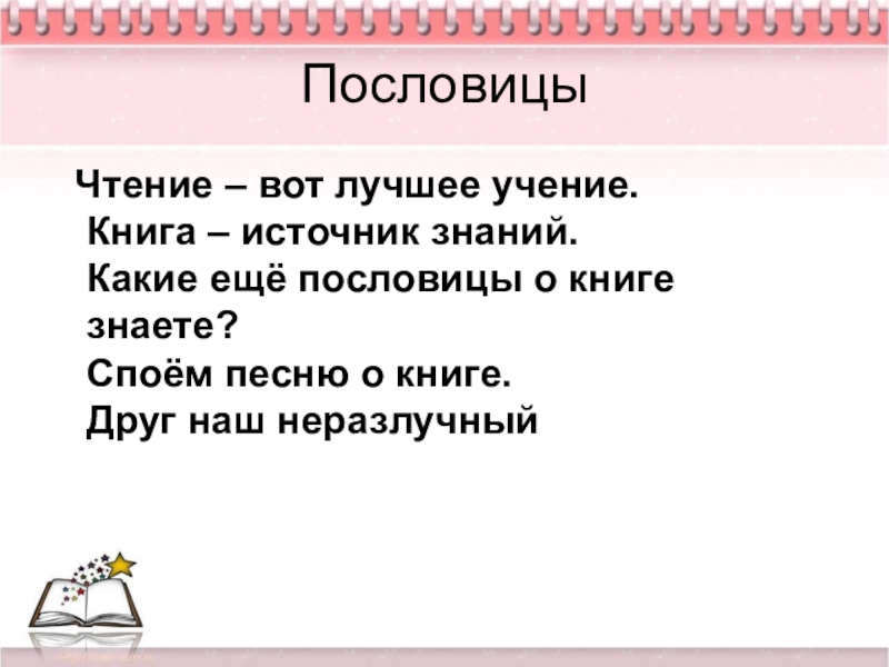 Пословицы  Чтение – вот лучшее учение. Книга – источник знаний. Какие ещё пословицы о книге знаете?