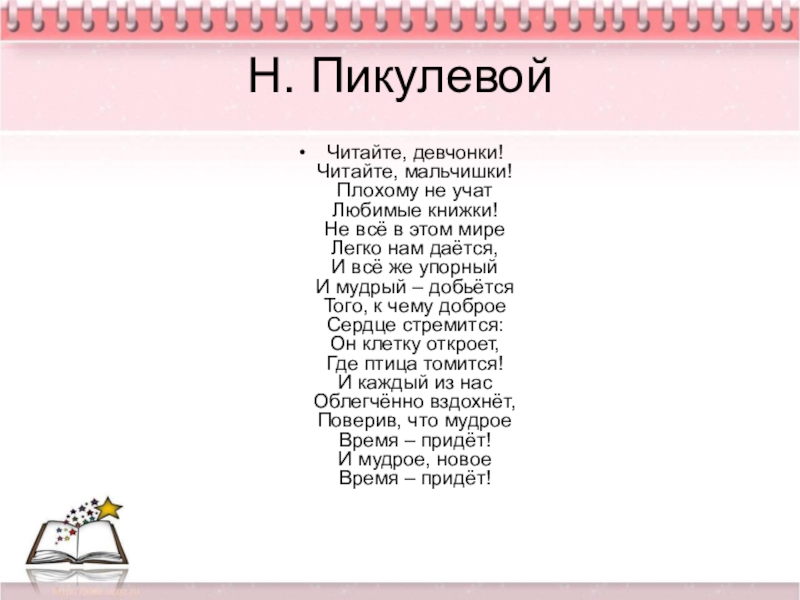 Н. Пикулевой Читайте, девчонки!  Читайте, мальчишки!  Плохому не учат  Любимые книжки!  Не всё в этом мире  Легко
