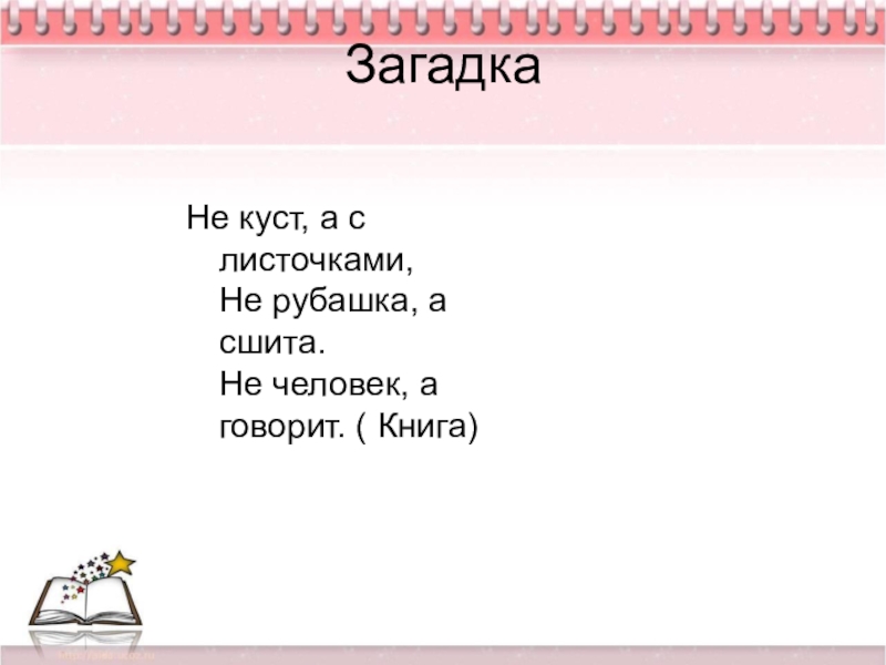 Загадка Не куст, а с листочками, Не рубашка, а сшита. Не человек, а говорит. ( Книга)