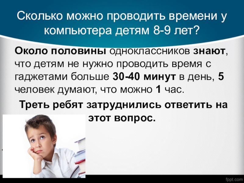 Слайд 17Сколько можно проводить времени у компьютера детям 8-9 лет?