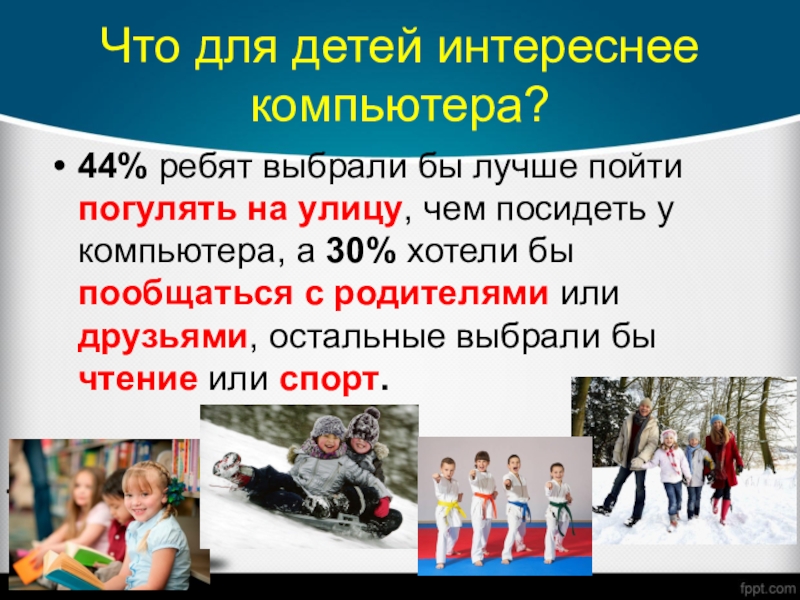 на улицу, чем посидеть у компьютера, а 30% хотели бы пообщаться с родителями или друзьями, остальные выбрали бы чтение или спорт.