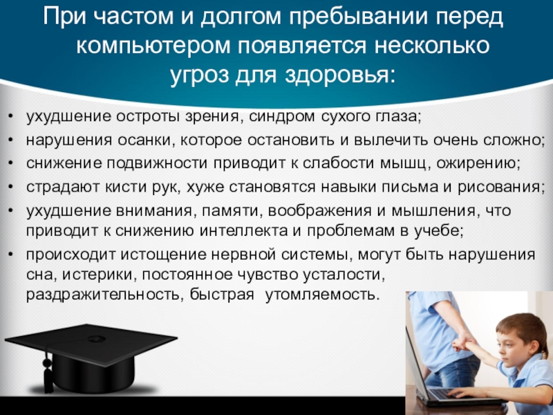 Слайд 21При частом и долгом пребывании перед компьютером появляется несколько угроз для