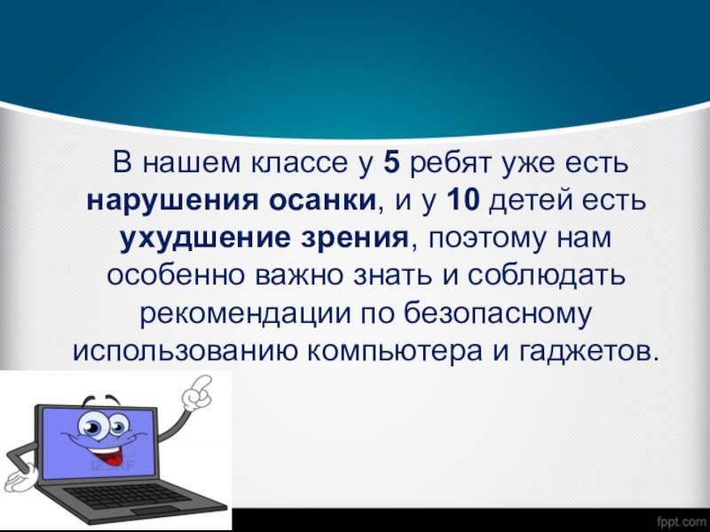 и у 10 детей есть ухудшение зрения, поэтому нам особенно важно знать и соблюдать рекомендации по безопасному использованию компьютера и гаджетов.