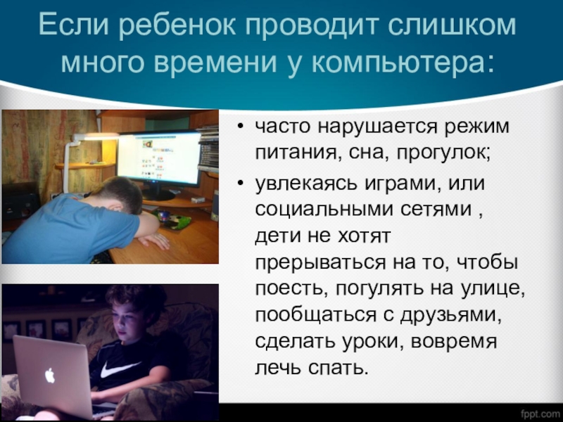увлекаясь играми, или социальными сетями , дети не хотят прерываться на то, чтобы поесть, погулять на улице, пообщаться с друзьями, сделать уроки, вовремя лечь спать.
